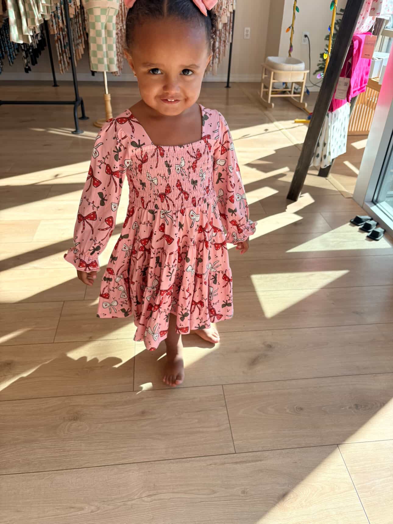 Holiday Bows Shirred Long Sleeve Dress